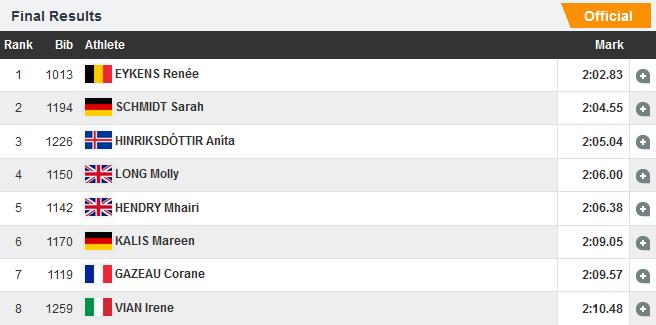 Na de eerste schermutselingen nam de IJslandse Hinriksdottir de leiding in deze 800 m, gevolgd door de Duitse Sarah Schmidt … en – wat dacht u – Renée Eykens. Na een goede 650 m ging Renée in de aanval op haar voorgangers … en een écht antwoord kwam er niet. Met ruime voorsprong en een tijd van 2’02″83 werd ze EUROPEES KAMPIOEN !!!